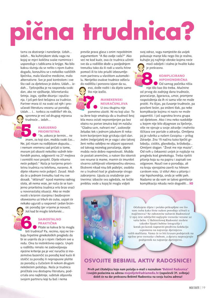 U svakom broju očekuje vas zanimljivi modni editorijal te redovne kolumne: bebina kolumna, kolumna mame te bračnog para s djetetom. Pratimo novitete na tržištu od modnih, kozmetičkih do medicinskih novosti koji mogu olakšati svakodnevicu trudnica, roditelja i djece.